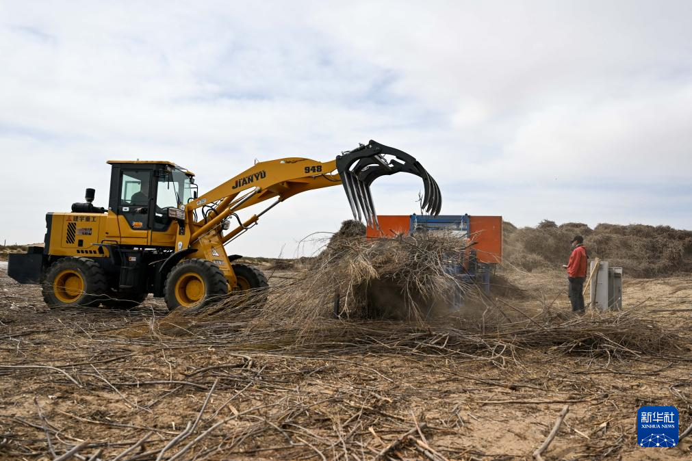 4月28日,在杭锦旗境内的库布其沙漠,治沙工人在裁剪沙柳。