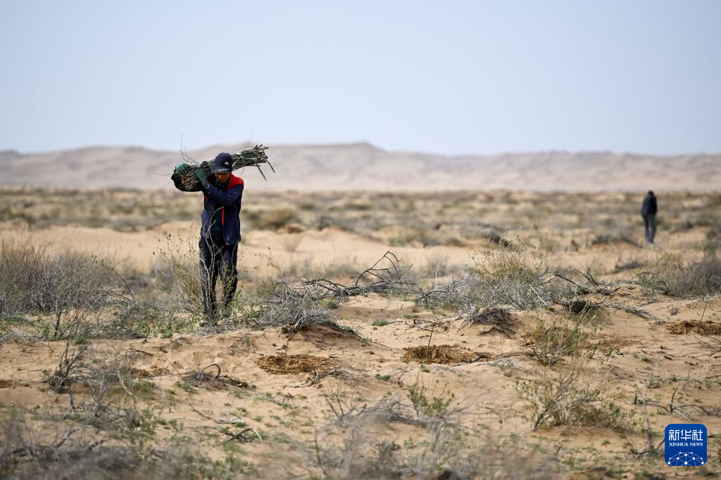 4月28日,在杭锦旗境内的库布其沙漠,治沙工人在搬运沙柳。