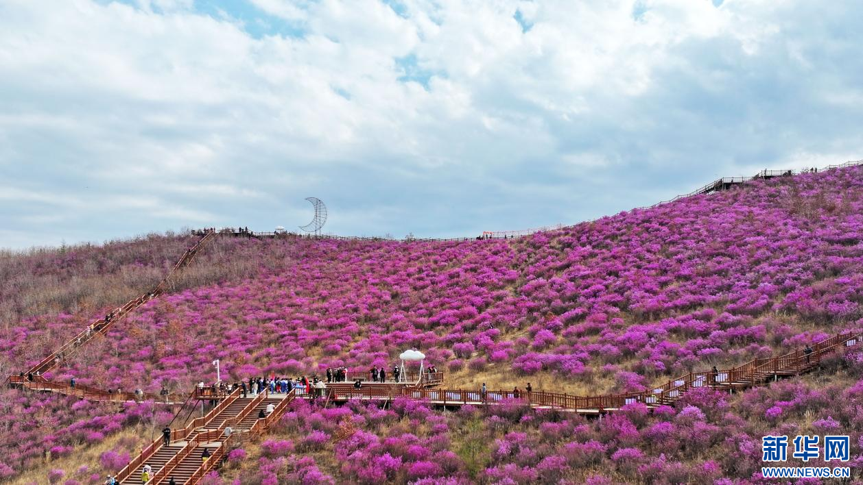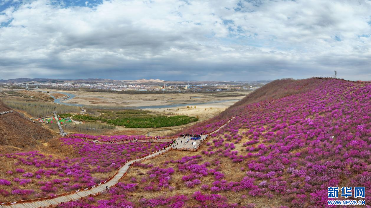 4月29日,内蒙古自治区扎兰屯市映山红休闲旅游区野生杜鹃花竞相绽放,大批游客前来赏花游玩。新华网发(韩颖群 摄)