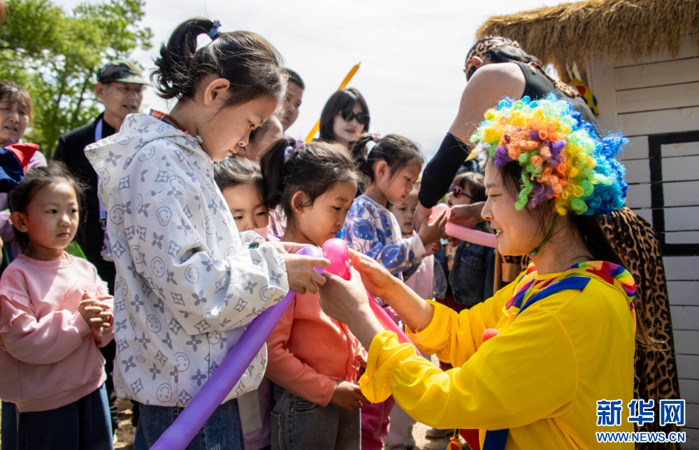 5月2日,工作人员在呼和浩特玉泉区大黑河郊野公园萌宠乐园内教孩子们做气球小动物。新华网发(丁根厚 摄)