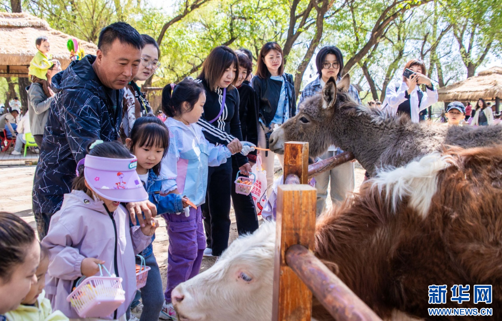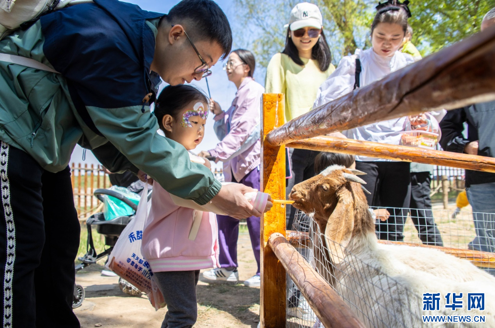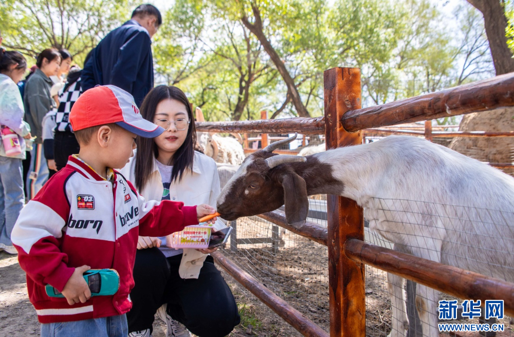 5月2日,家长陪伴孩子在呼和浩特玉泉区大黑河郊野公园萌宠乐园内喂食小动物。新华网发(丁根厚 摄)