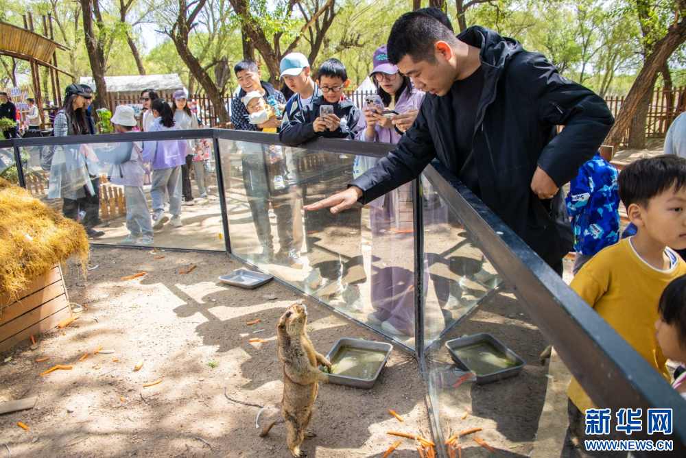 5月2日,家长陪伴孩子在呼和浩特玉泉区大黑河郊野公园萌宠乐园内与土拨鼠互动。新华网发(丁根厚 摄)