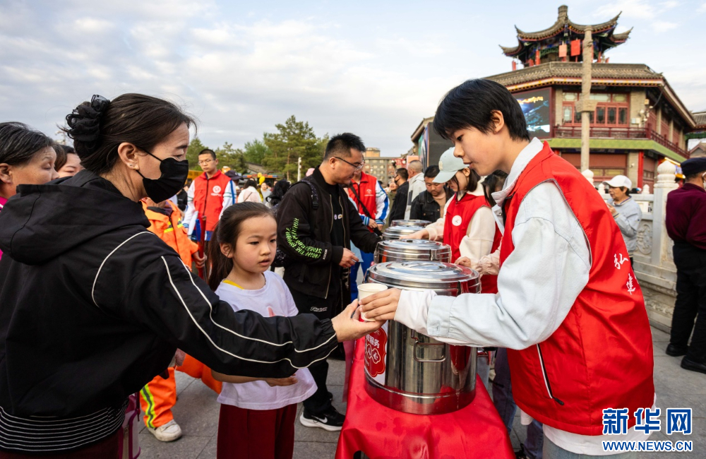 5月1日,呼和浩特市玉泉区新时代文明实践志愿者在第六届塞上老街音乐美食季活动现场为游客送上奶茶。新华网发(丁根厚 摄)