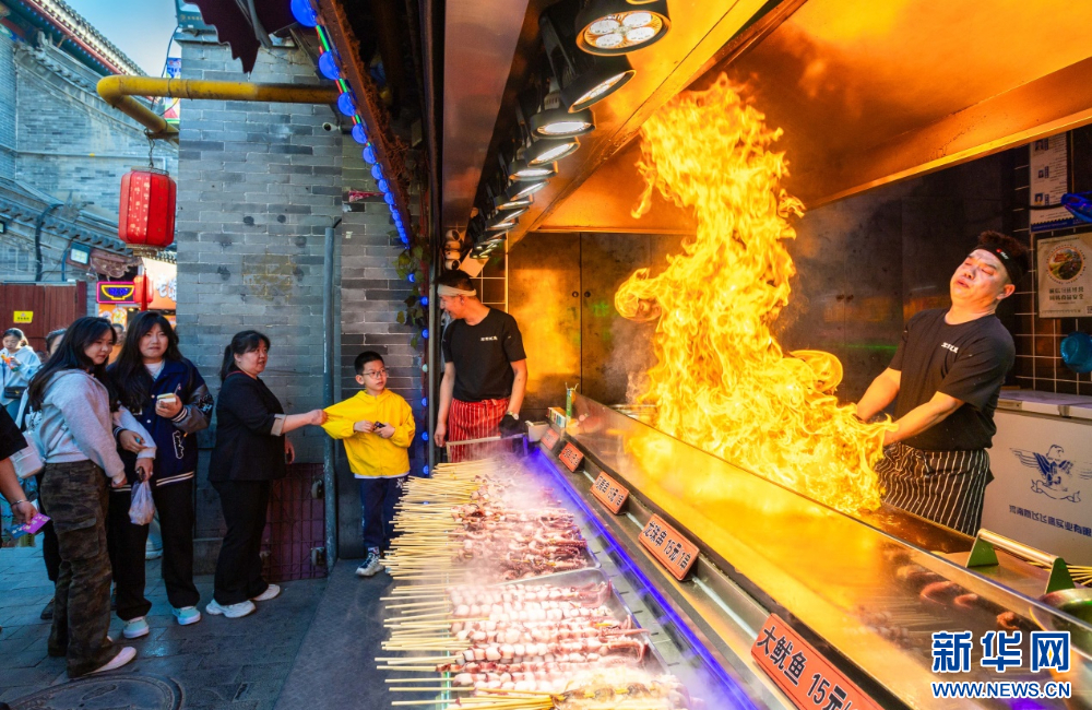 5月1日,摊主在第六届塞上老街音乐美食季夜市街区为游客制作火爆鱿鱼。新华网发(丁根厚 摄)
