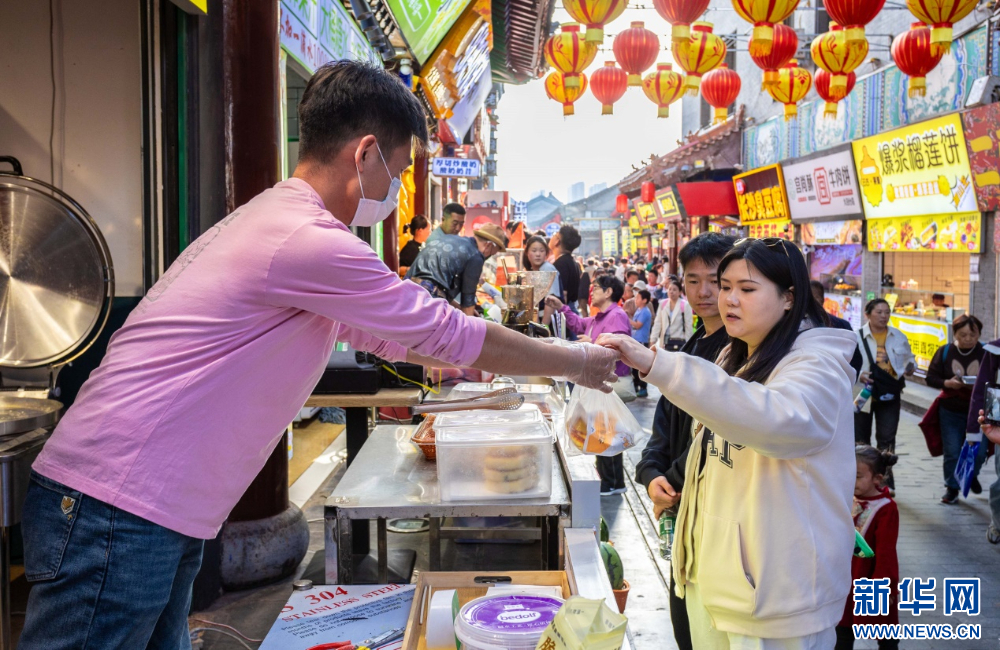 5月1日,游客在第六届塞上老街音乐美食季夜市街区选购特色小吃。新华网发(丁根厚 摄)