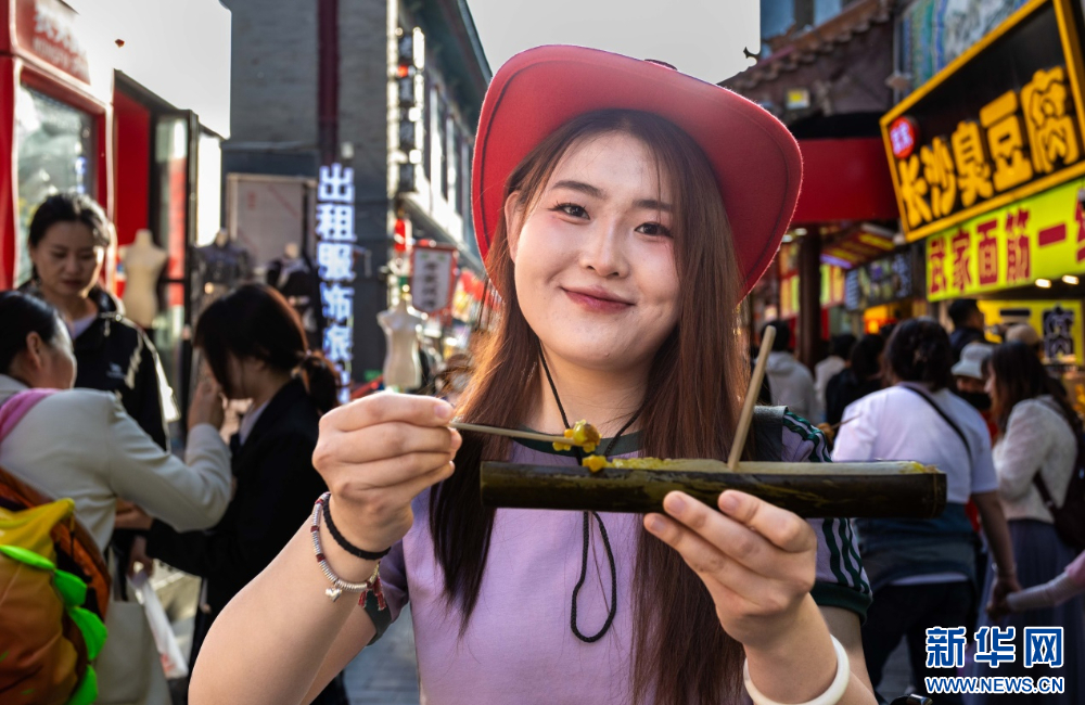 5月1日,游客在第六届塞上老街音乐美食季夜市街区品尝特色小吃。新华网发(丁根厚 摄)