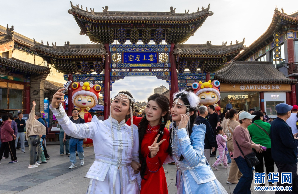5月1日,旅拍游客在第六届塞上老街音乐美食季活动现场打卡拍照。新华网发(丁根厚 摄)
