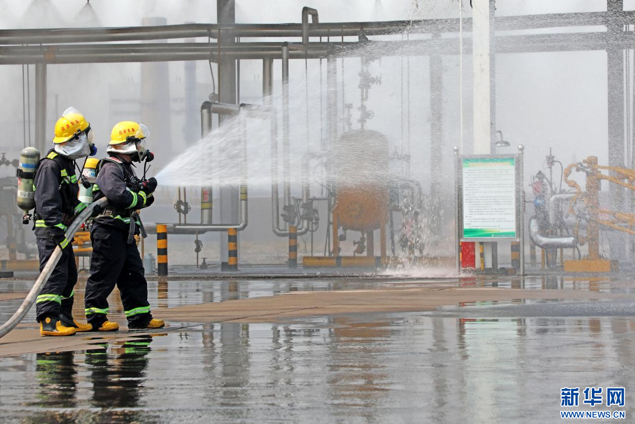 5月12日,企业消防队员在内蒙古翔丰化工有限公司进行稀释应急演练。新华网发(韩颖群 摄)