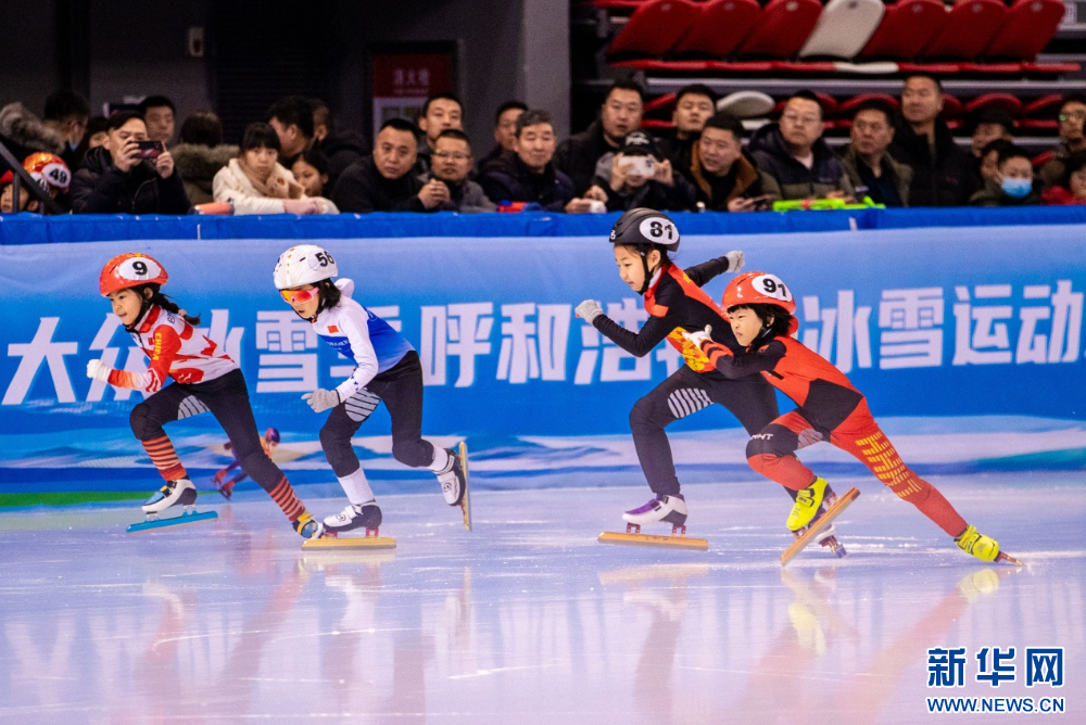 2024年12月15日, 参赛小选手在在第十一届全国大众冰雪季呼和浩特市冰雪运动系列活动短道速滑公开赛比赛中。新华网发(丁根厚 摄)