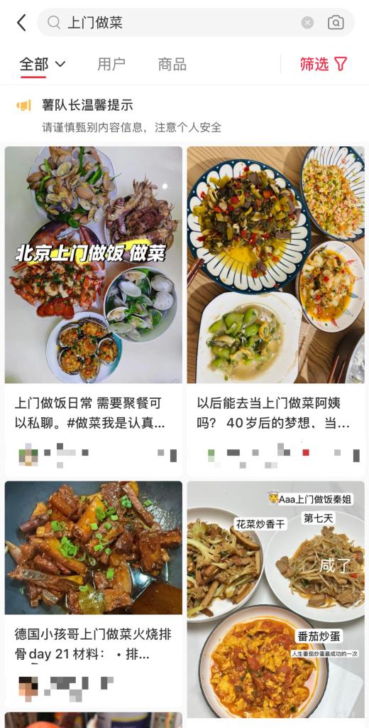 记者了解到,上门做菜服务正逐渐兴起并受到不少人欢迎。和彤彤一样在社交平台上提供上门服务的人并不在少数。在小红书平台搜索“上门代厨”“上门做菜”等话题有超万篇笔记,一些B站博主发布#请人上门做饭,是一种什么体验#等相关视频,点击量达百万次。