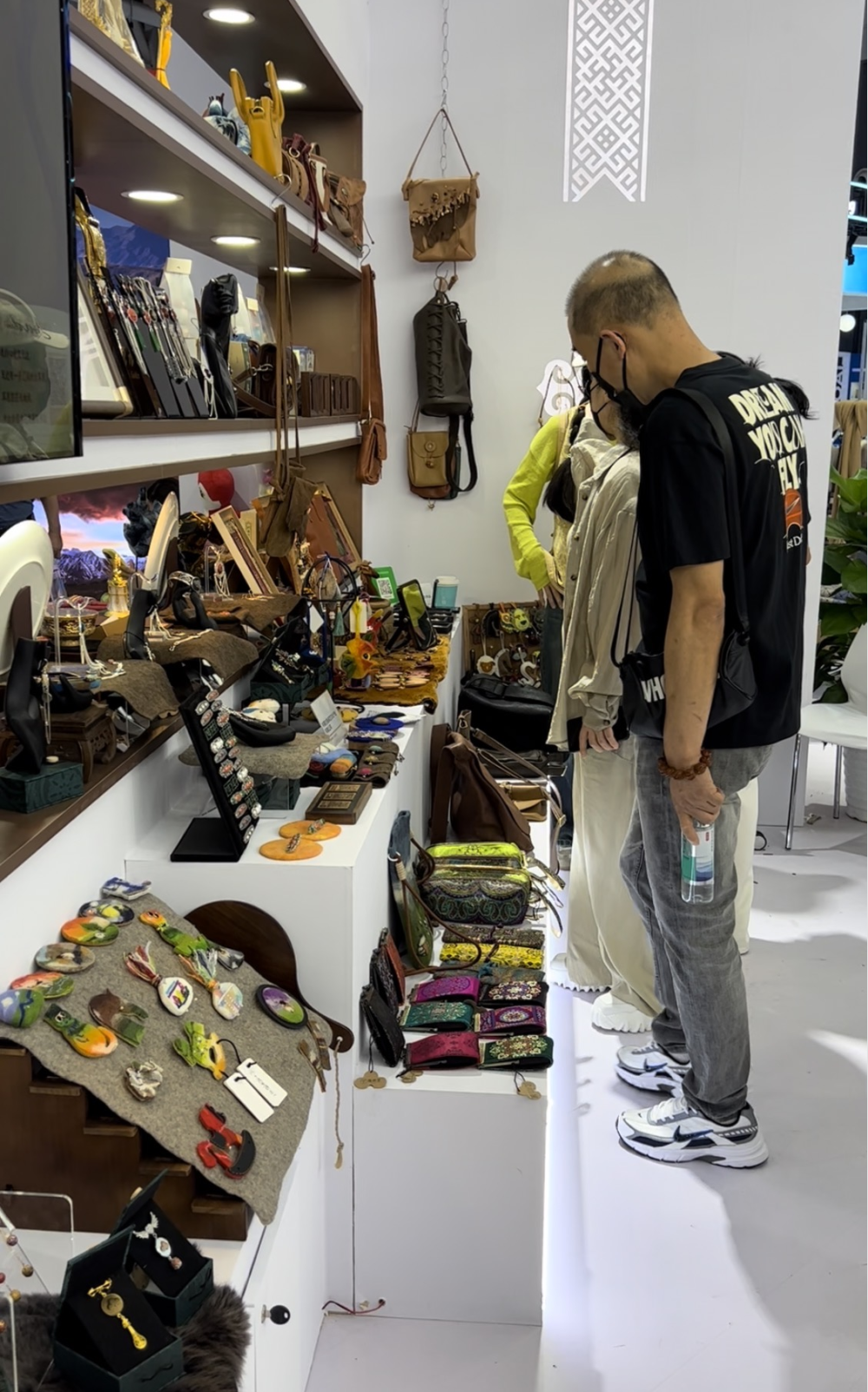 以乌拉特刺绣为代表的非遗作品在展区内吸引了大批游客。据乌拉特刺绣代表性传承人娜仁高娃介绍,这次带来的作品以蒙古扁桃(巴达玛花)为核心纹样,因其能在恶劣环境中蓬勃生长、旺盛绽放,不仅在外形上寓意坚韧与茁壮,同时也代表了人与自然和谐相处的情感。