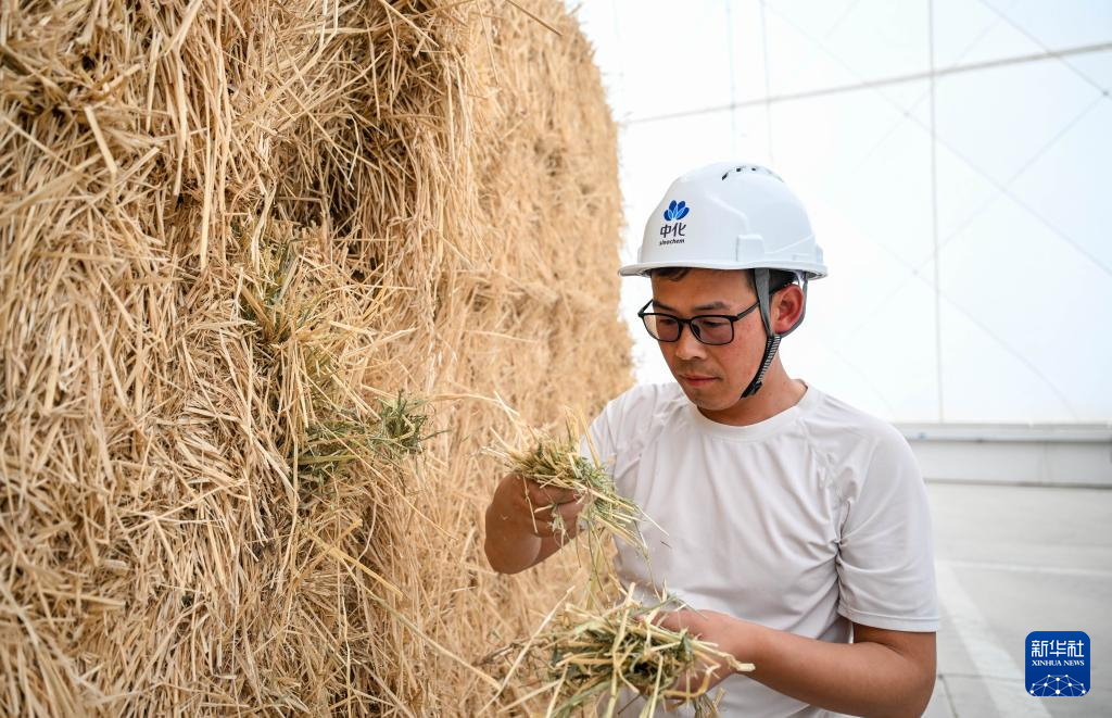 5月22日,技术人员在赤峰市阿鲁科尔沁旗的现代化牧草储备库中查看牧草品质。