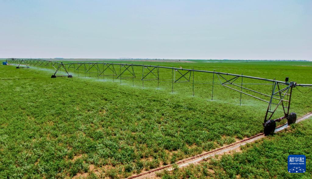 5月22日,在赤峰市阿鲁科尔沁旗,自走式喷灌机在为牧草浇水。