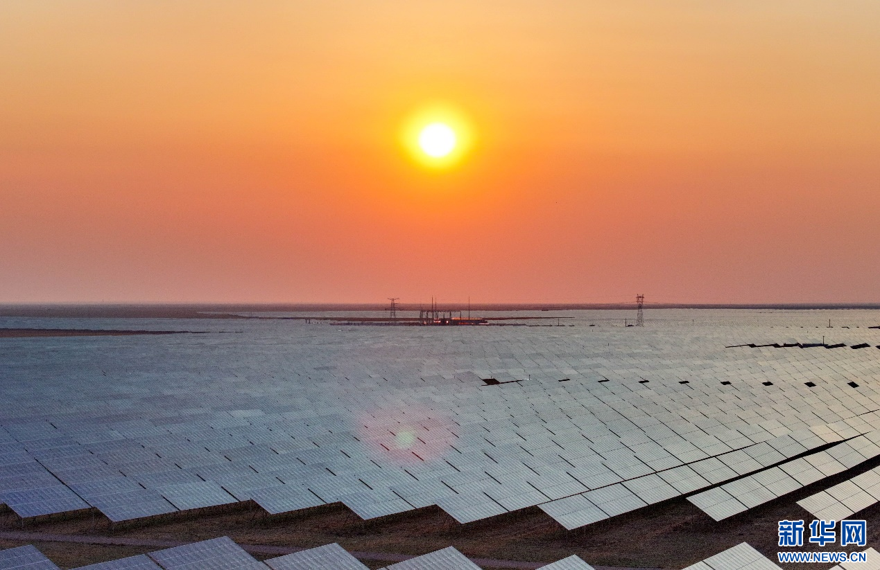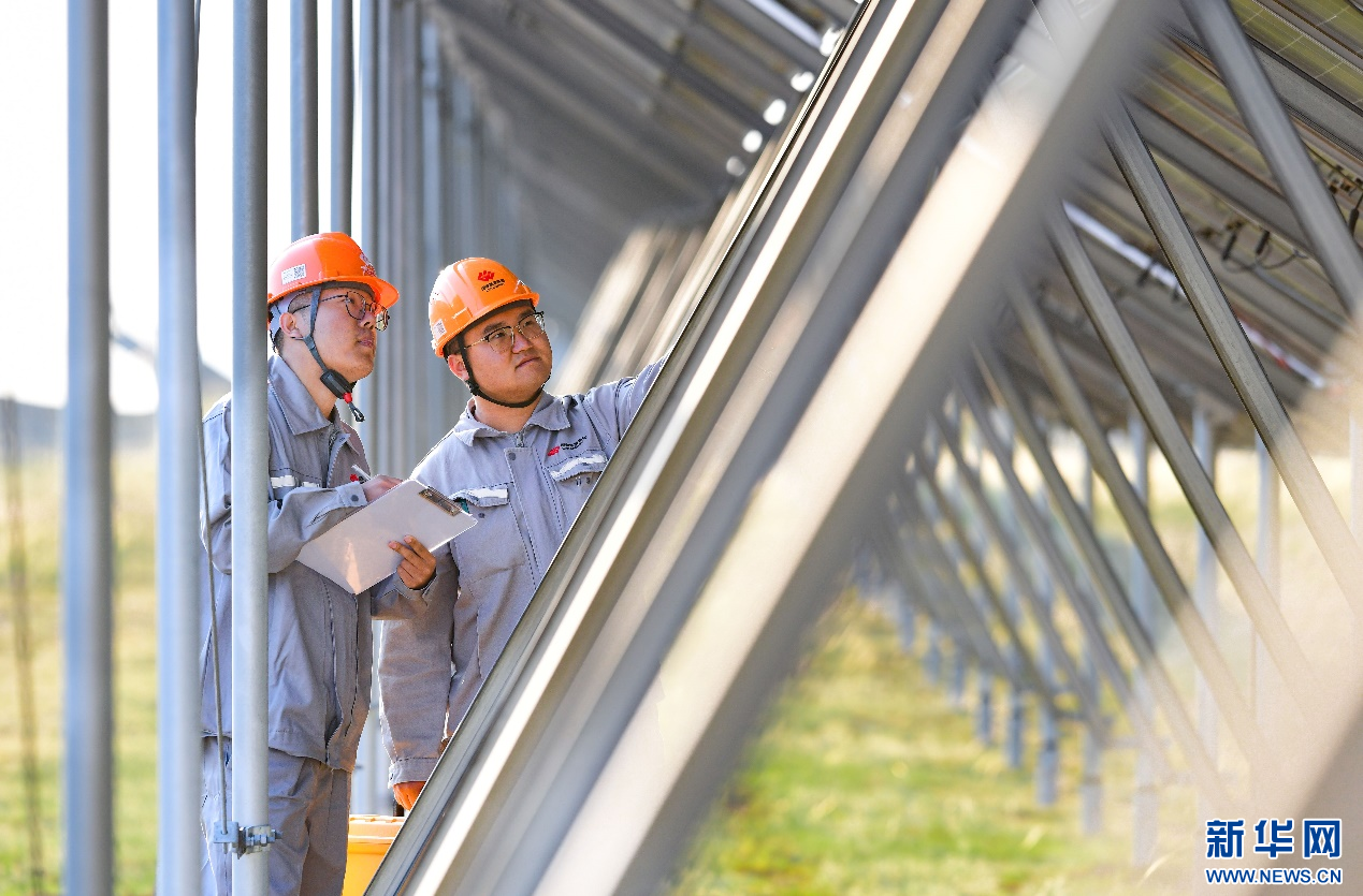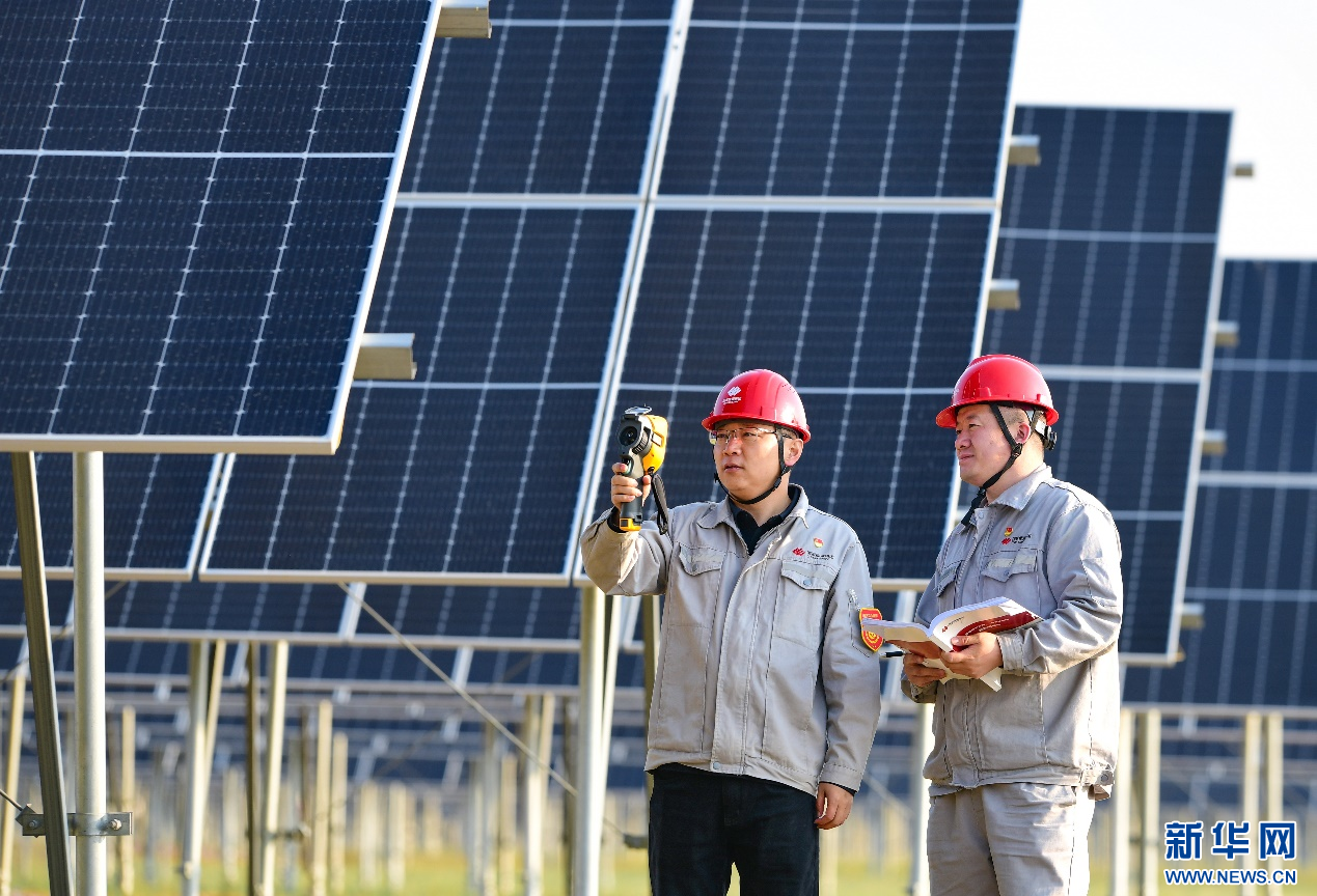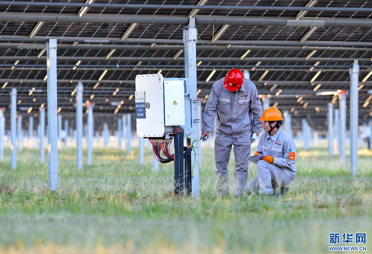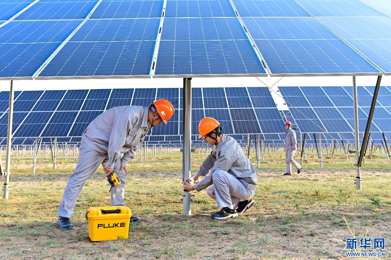 5月23日,工人在鄂尔多斯市鄂托克前旗采煤沉陷区400万千瓦新能源基地巡查。新华网发(王正 摄)