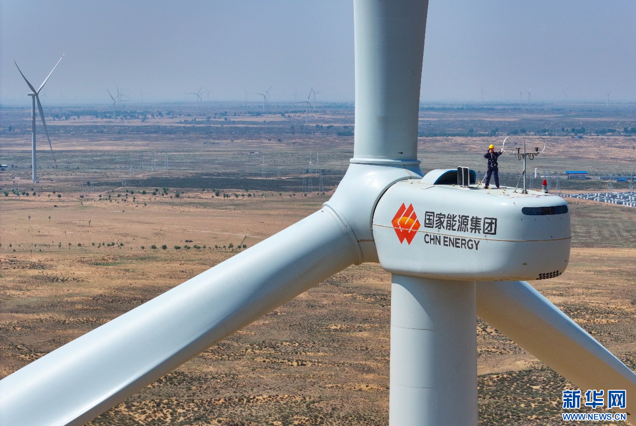 5月23日,工人在鄂尔多斯市鄂托克前旗30万千瓦上海庙风电场调试设备(无人机照片)。新华网发(王正 摄)