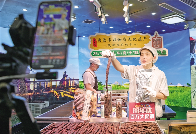 5月26日,在通辽市奈曼旗内蒙古白音杭盖食品有限公司生产车间内,工作人员正在直播销售牛肉干。该公司成立非遗就业工坊,培训吸纳脱贫人口和低收入家庭,截至目前,已培训450人,带动130人就业。(记者 孟和朝鲁 摄)