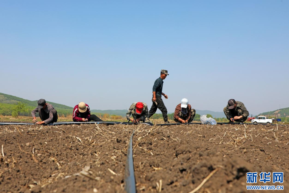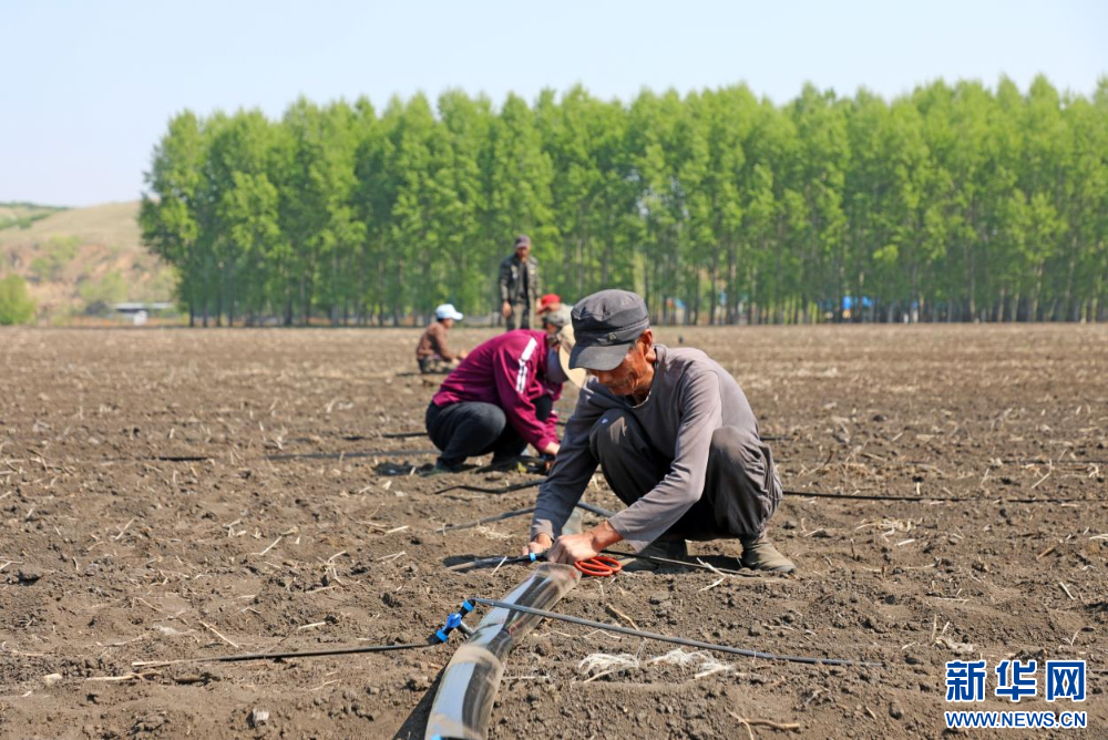 5月27日,内蒙古自治区扎兰屯市成吉思汗镇河口村田间,农民铺设安装浅埋滴灌水肥一体化供水管。新华网发(韩颖群 摄)