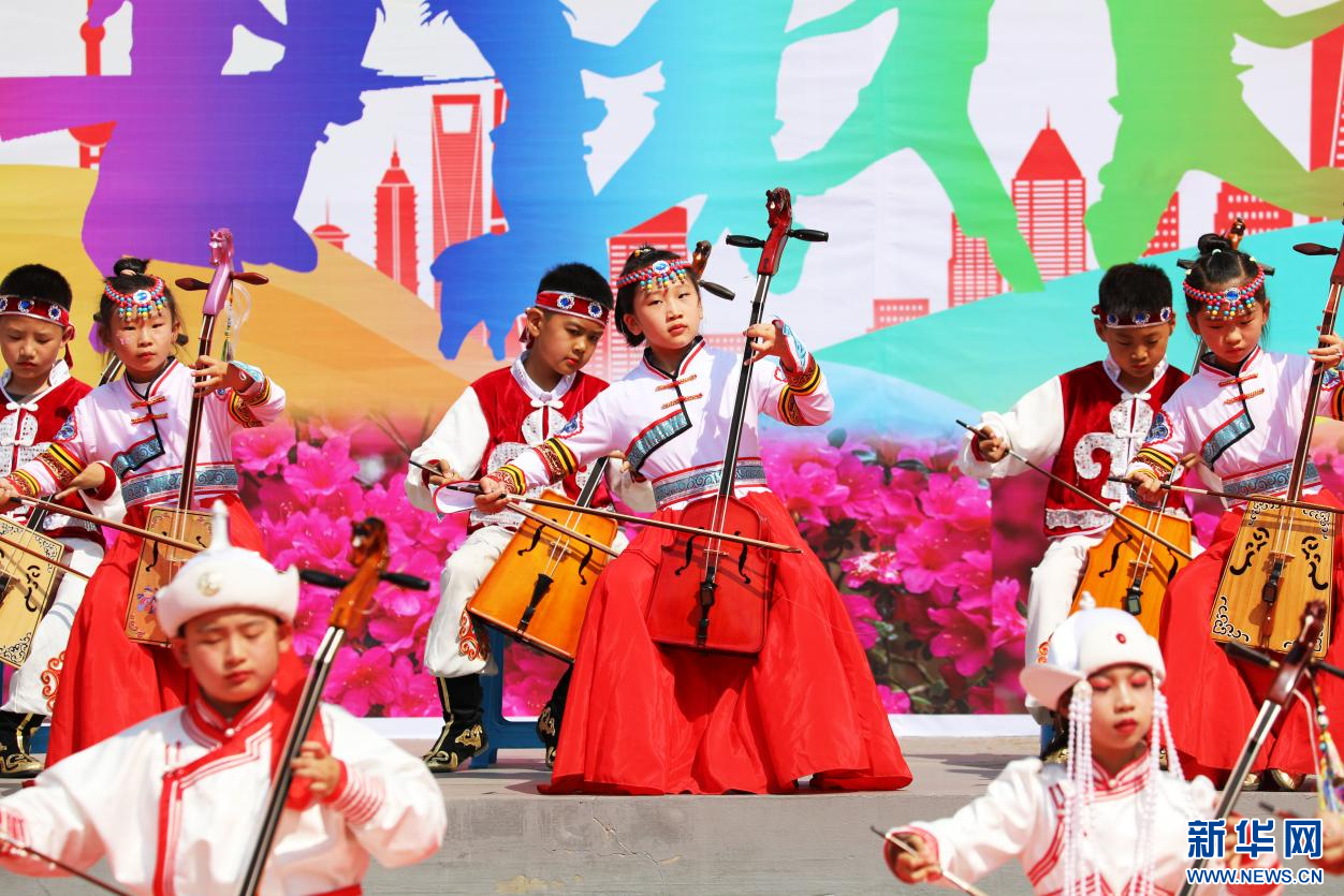 5月28日,内蒙古自治区扎兰屯市实验小学校园文化艺术节上,学生们进行马头琴演奏。新华网发(韩颖群 摄)