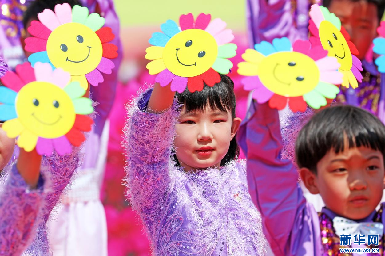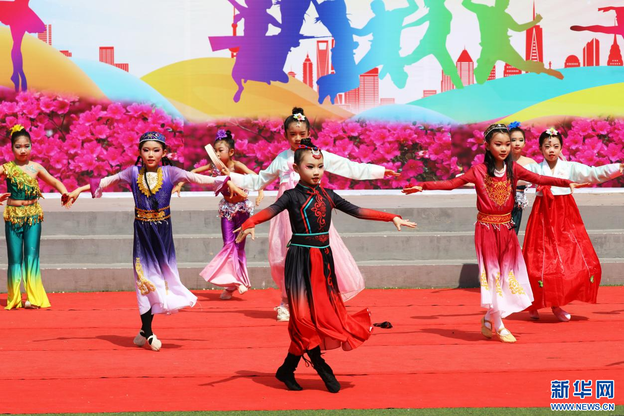 5月28日,内蒙古自治区扎兰屯市实验小学校园文化艺术节上,学生们进行《中华民族一家亲》舞蹈表演。新华网发(韩颖群 摄)