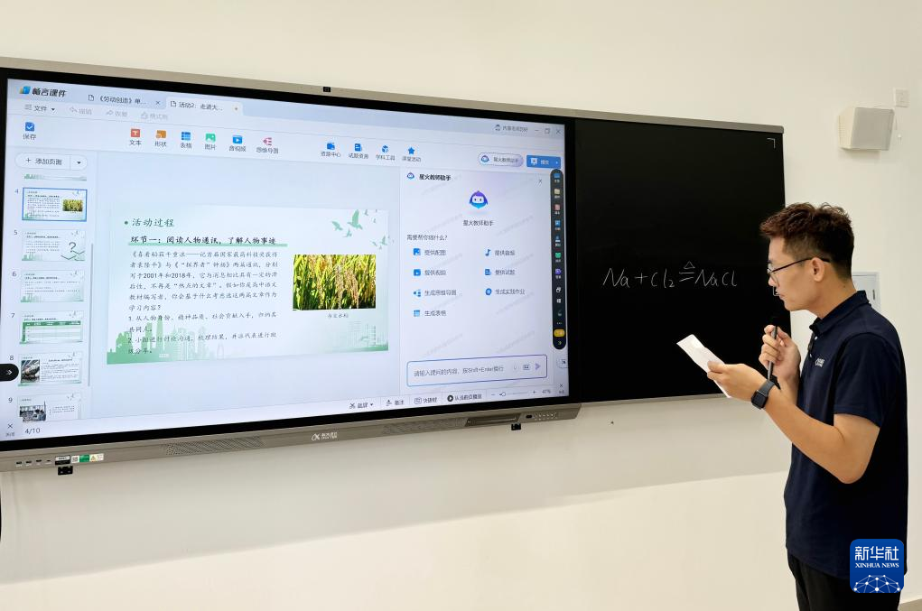 2024年7月20日,科大讯飞股份有限公司的工作人员在和林格尔新区内蒙古师范大学附属云谷学校展示人工智能产品“智慧黑板”。新华社记者 王靖 摄