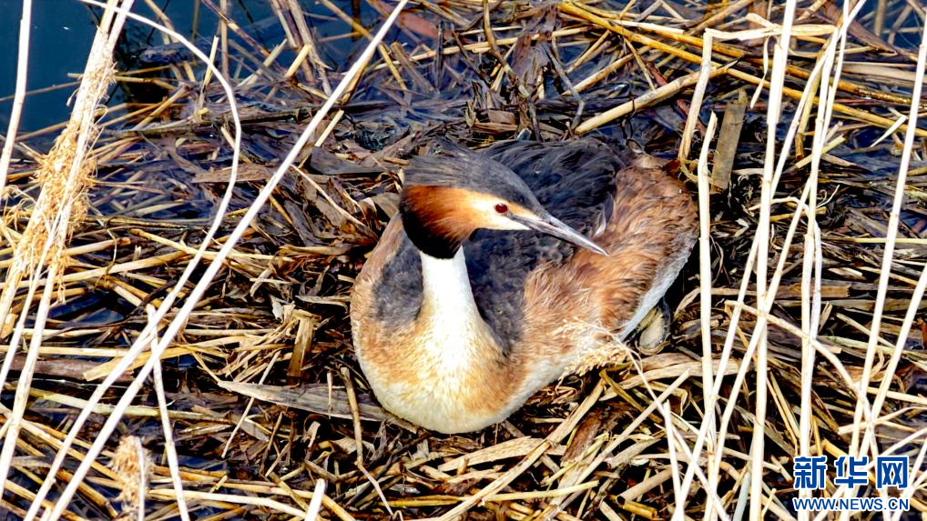 5月29日,在赤峰市松山区银河谷湿地,凤头鸊鷉在巢中孵化幼鸟。