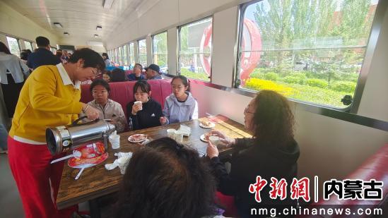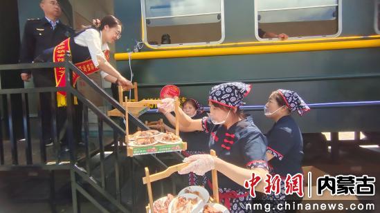 游客们登上火车车厢的观景台,泛黄的老照片、复古的车票墙与窗外“铁轨市集”的烟火气交织,唤醒人们对绿皮火车时代的集体记忆,不少游客打卡拍照,定格“舌尖上的乡愁”。
