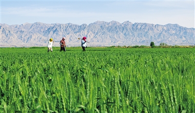 6月6日,巴彦淖尔市杭锦后旗蒙海镇红建村的农民前往麦田劳作。该镇建成了万亩小麦连片种植基地及麦后复种燕麦草基地,并对接中粮集团、河北金沙河等企业开展订单种植合作,解决农产品销售难题。2025年,巴彦淖尔市小麦种植面积达60.72万亩,目前小麦长势喜人,已进入抽穗期。记者 马骏驰 摄