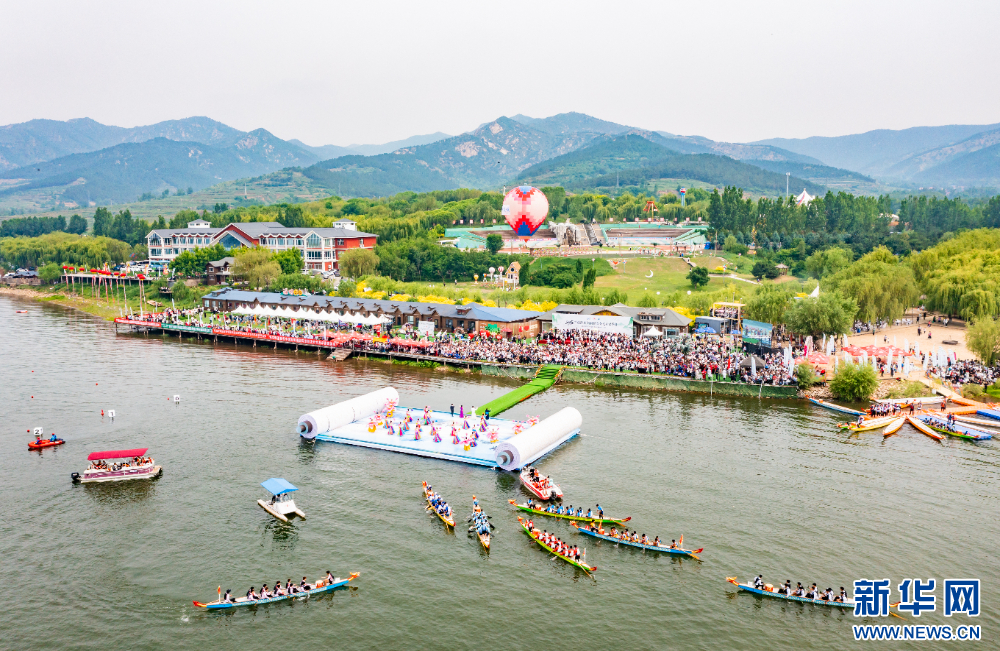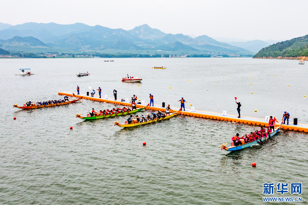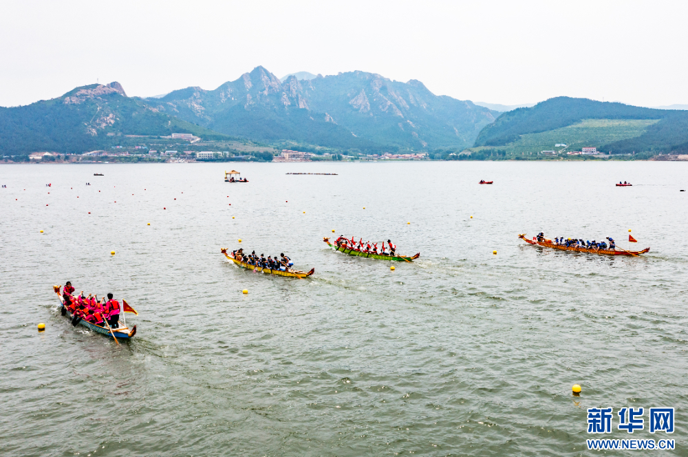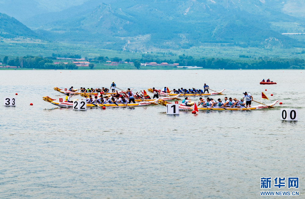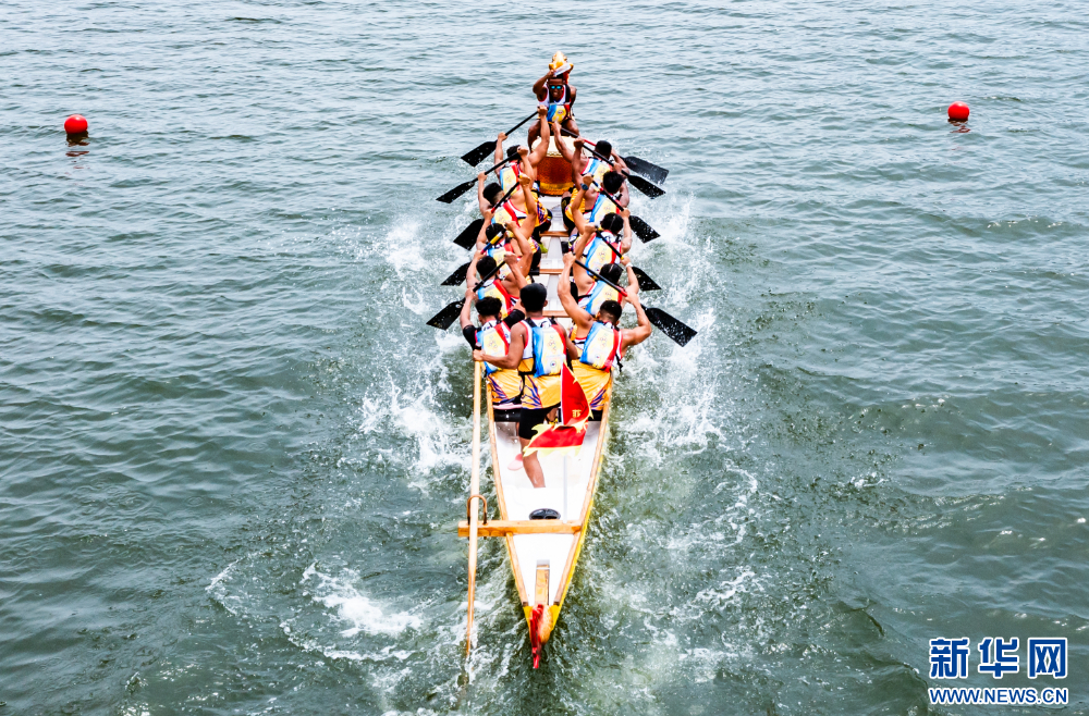6月14日,参赛龙舟队在比赛中角逐。新华网发(齐学涛 摄)