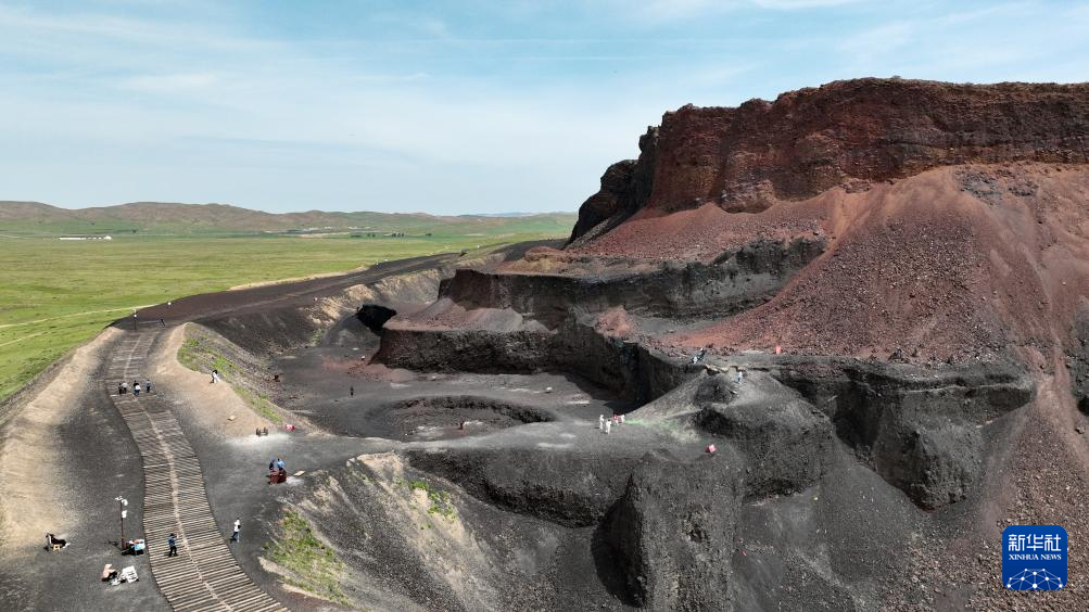 6月17日,游客在内蒙古乌兰察布市察哈尔右翼后旗内蒙古乌兰哈达火山地质公园6号火山游玩(无人机照片)。