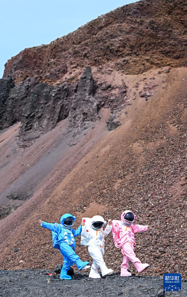 6月17日,身着宇航服装扮的游客在乌兰哈达火山群6号火山游玩。