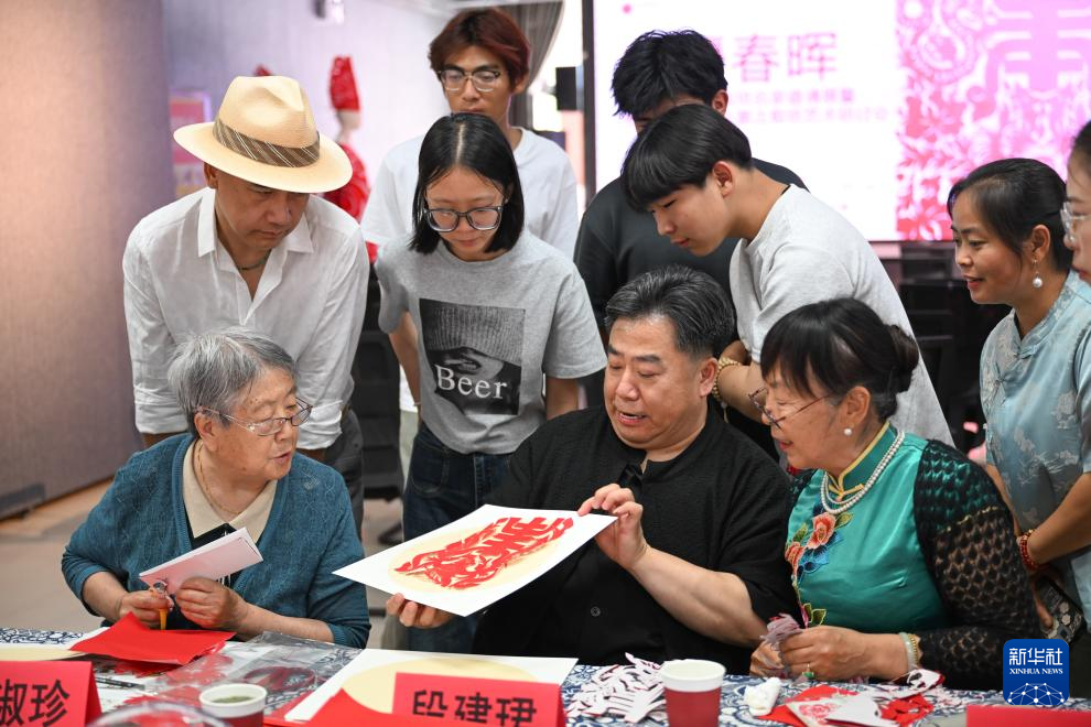 6月20日,剪纸艺术家马淑珍(前左)在呼和浩特职业学院美术馆创作剪纸作品。