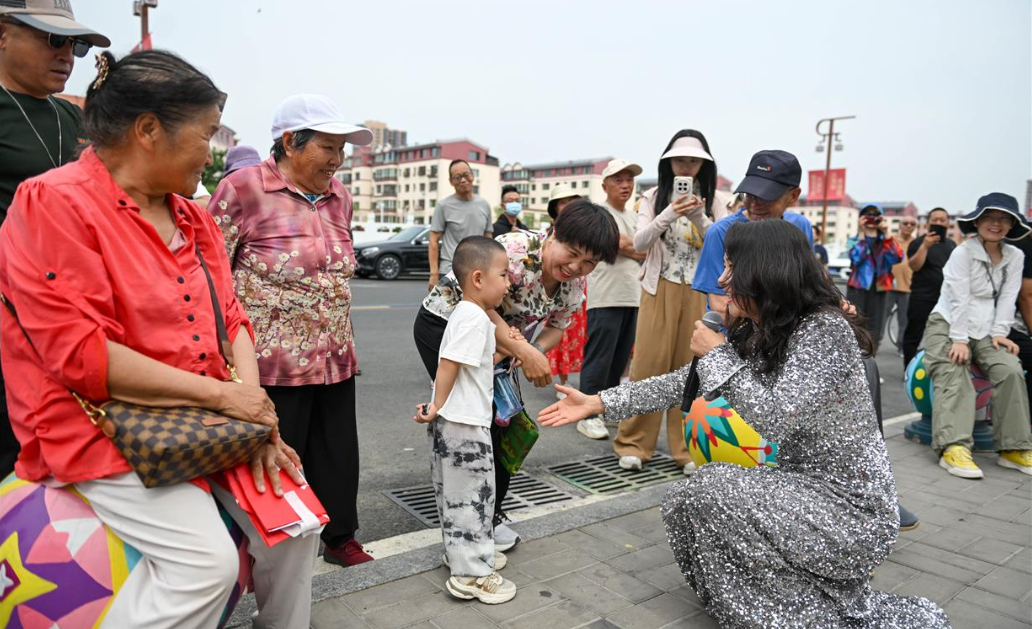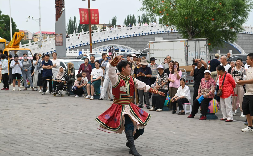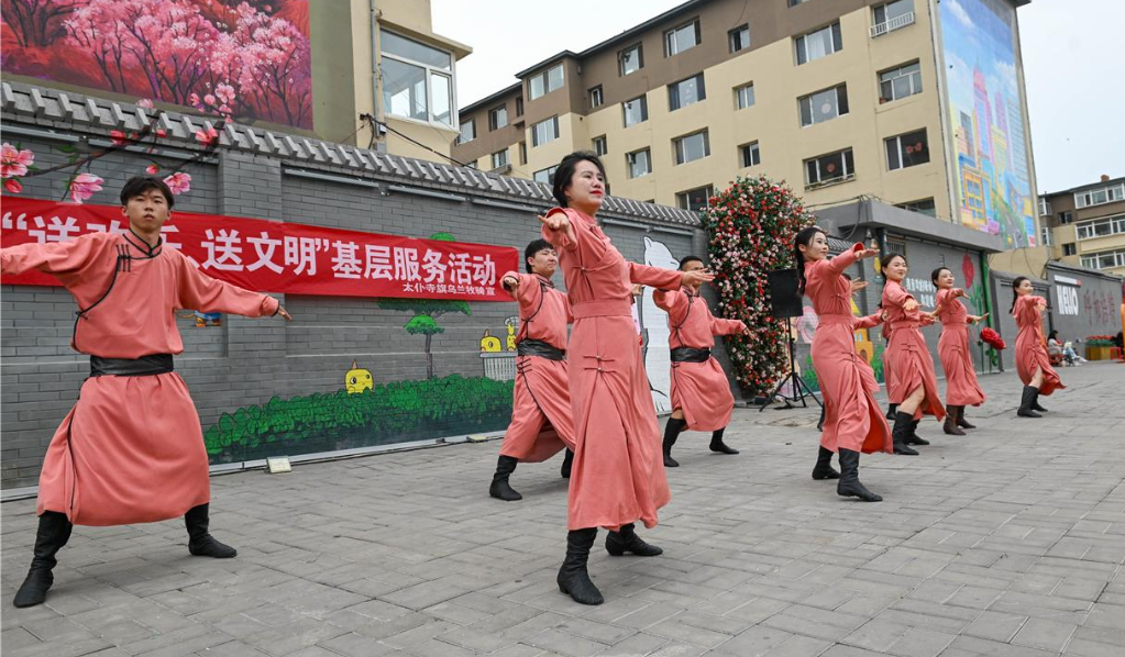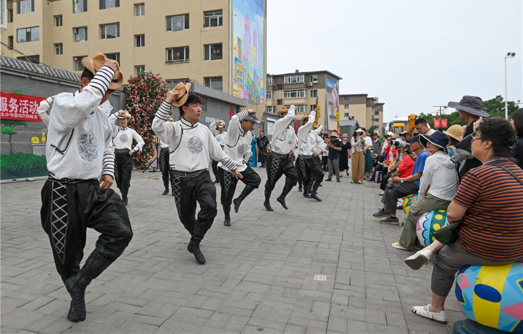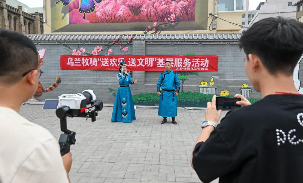 6月30日,锡林郭勒盟太仆寺旗乌兰牧骑队员在呼和浩特市回民区通道街滨河路社区为居民开展惠民演出。