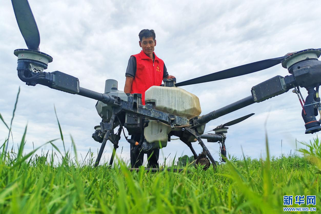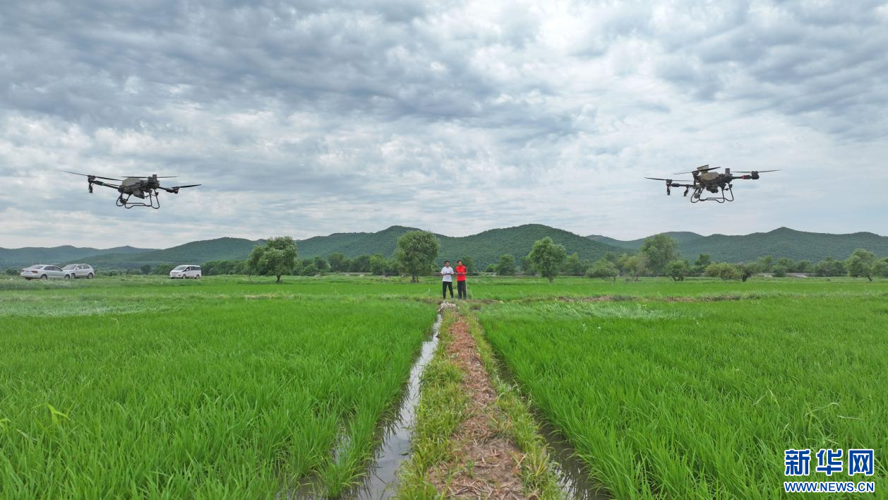 在农田夏管之际,内蒙古呼伦贝尔农垦扎兰屯农牧场有限公司农技人员操纵搭载北斗导航系统的植保无人机,为水稻施肥。植保无人机省时、省油耗、省人力,可提高生产效率,助力增产增收。