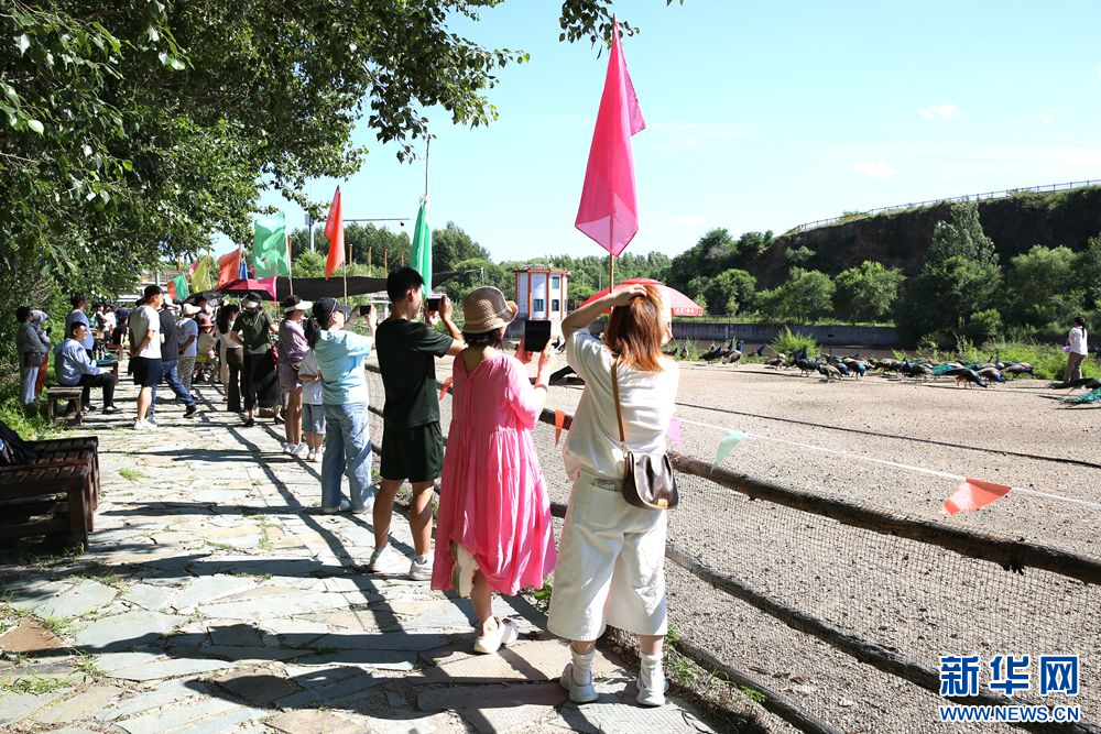 7月6日,游客在乌兰浩特洮儿河国家湿地公园内的风光景区观赏“孔雀飞天”盛宴。新华网 石毅 摄