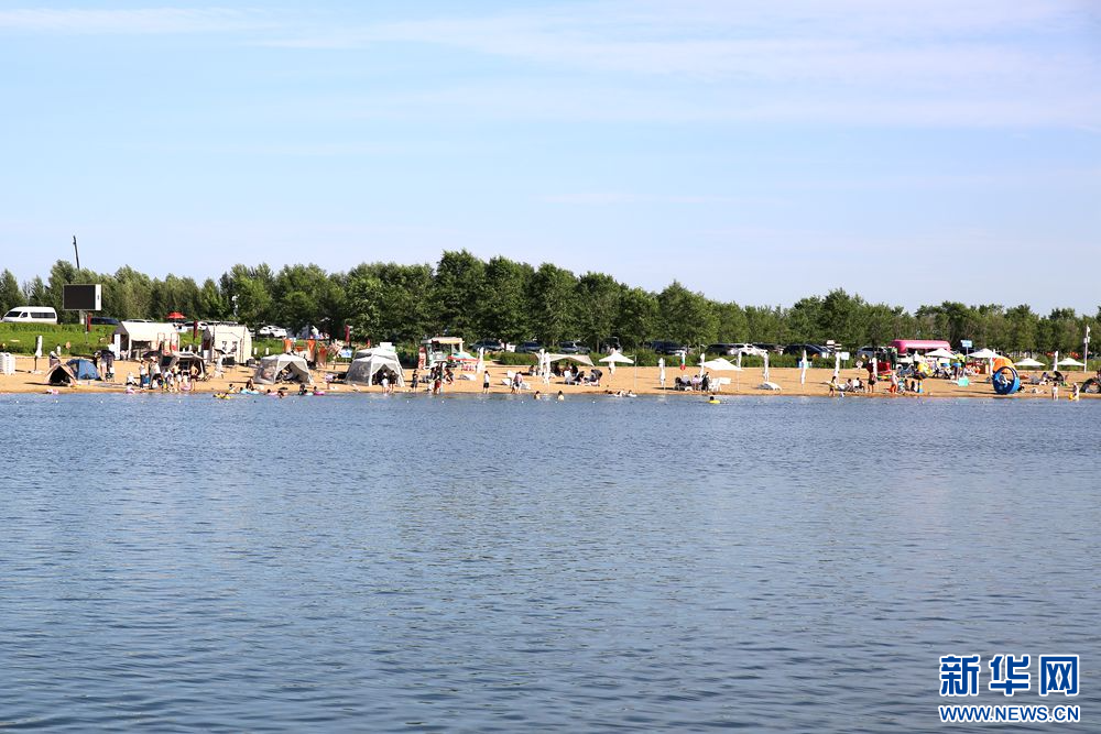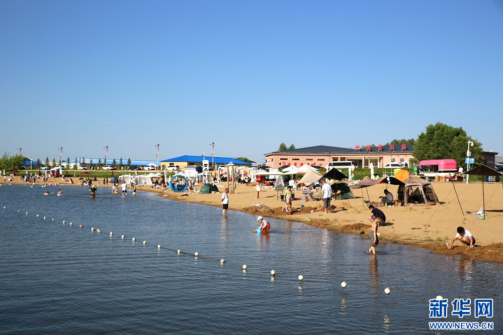 新华网呼和浩特7月7日电(石毅)微风轻拂,湖面泛起层层涟漪,金色沙滩上,一顶顶白色的帐篷错落有致,游客在湖边尽情享受休闲时光……在内蒙古乌兰浩特市乌兰哈达镇高根营子嘎查的神骏湾,被当地人称为“小三亚”。