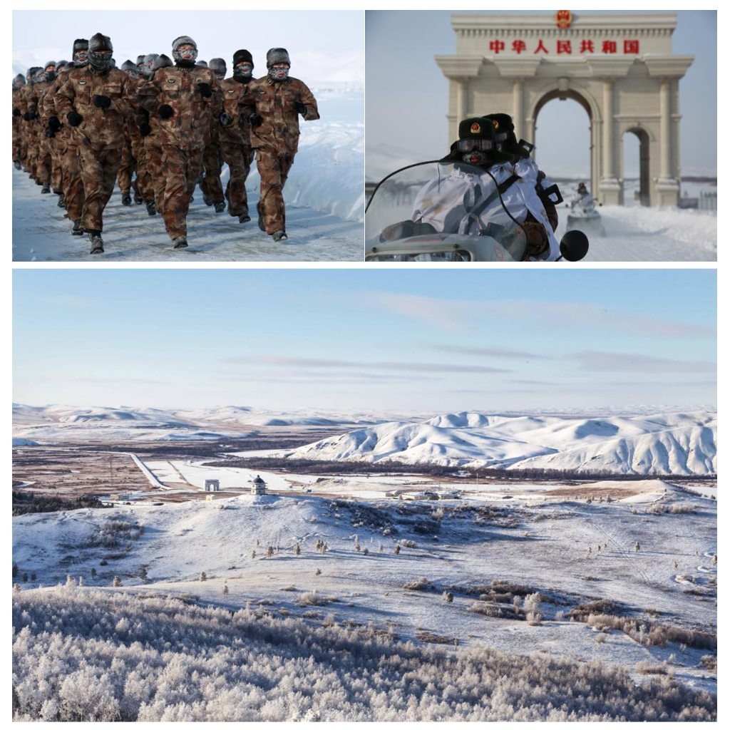 左上:北部战区陆军某边防旅三角山哨所官兵在积雪中开辟的跑道上进行抗严寒体能训练(2018年1月31日摄)。