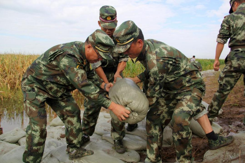 2013年 8月20日,武警内蒙古兴安盟森林支队官兵在扎赉特旗努文木仁苏木境内嫩江下游河段搬运沙袋、加固堤防。