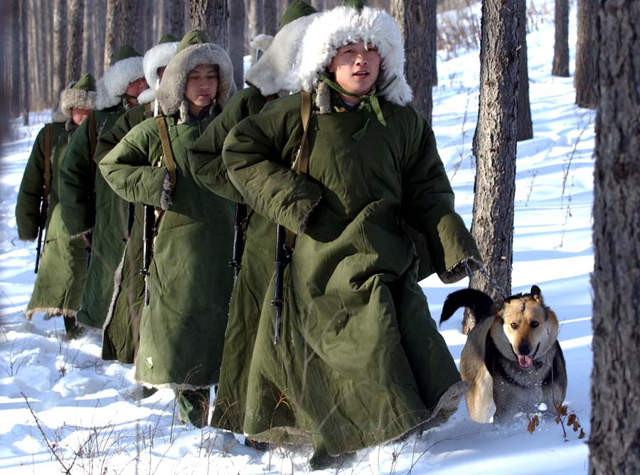 2003年2月28日,冒着零下30多度的严寒,武警内蒙古边防总队兴安盟支队阿尔山工作站巡逻队踏着积雪在边境地区原始森林中巡逻。