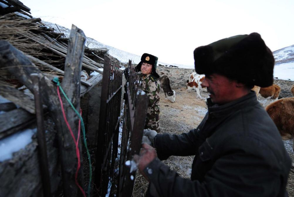 2010年11月30日,科右前旗乌兰毛都边防派出所帮助牧民孟根加修理棚圈。