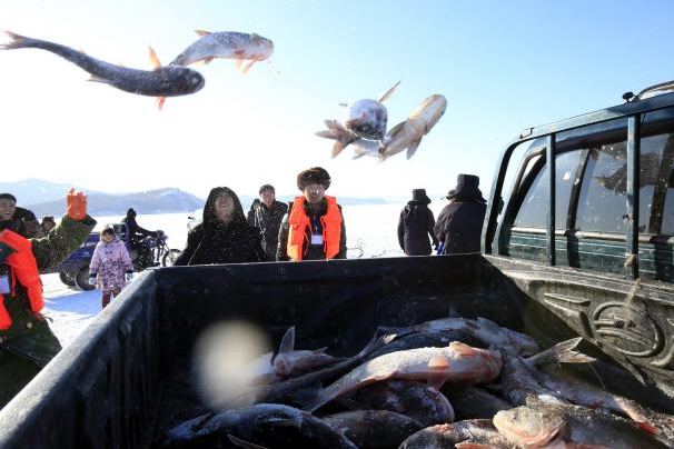 2014年12月20日,人们在兴安盟察尔森湖观看冬捕场景。