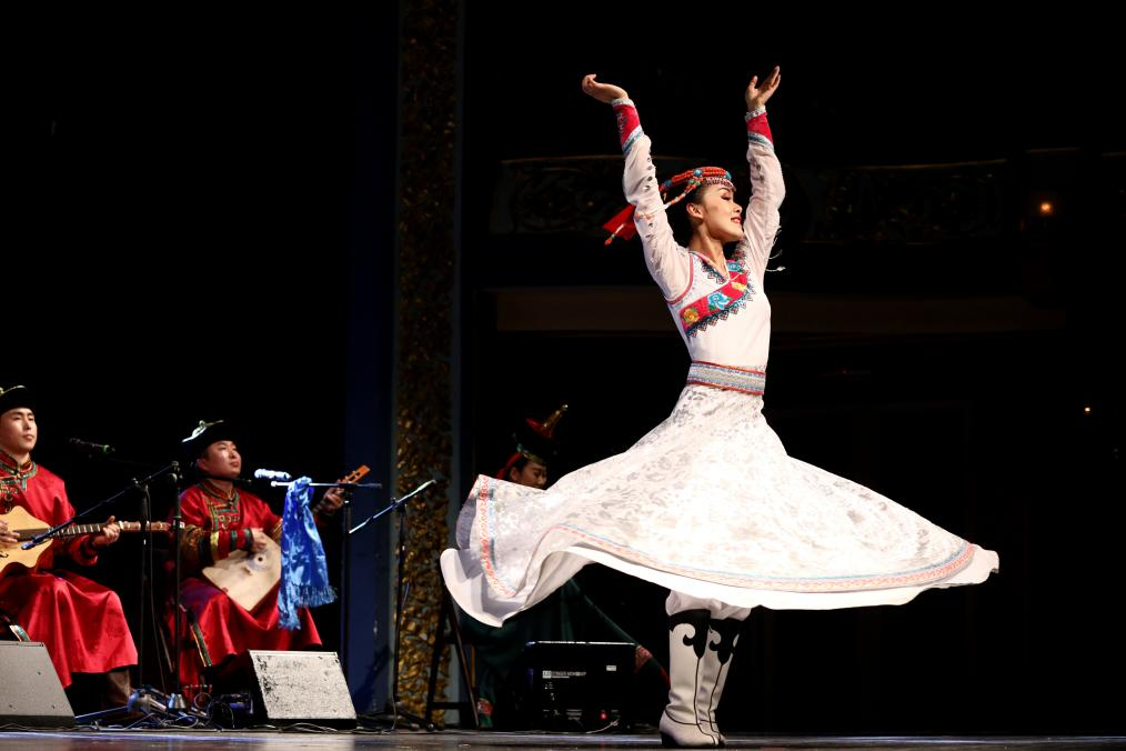 2019年2月19日,在欧洲举行的“欢乐春节”演出上,兴安盟民族歌舞团的演员在表演舞蹈。