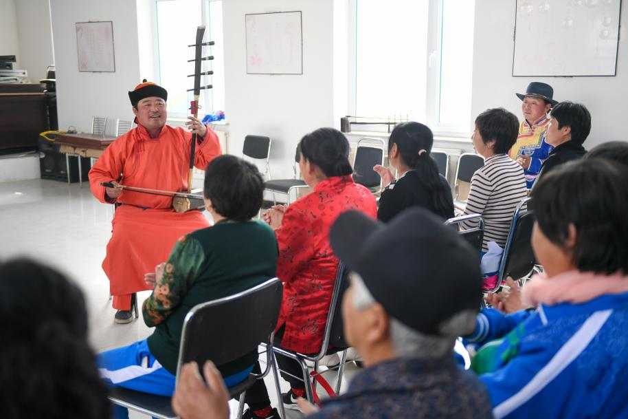 2019年4月17日,科尔沁右翼中旗巴彦敖包嘎查的蒙古族村民在乡村文化活动室表演蒙古族艺术乌力格尔。