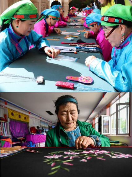 上图:2019年8月1日,绣娘在兴安盟举行的中国手工刺绣成果展现场表演刺绣。