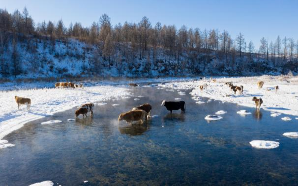 2019年11月20日,牛群在阿尔山“不冻河 ”中饮水。