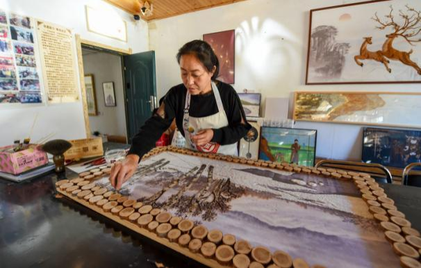 2022年9月20日,阿尔山市白狼镇的手艺人在制作桦树皮工艺品。