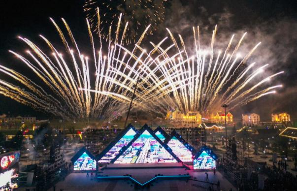 2023年中国(阿尔山)旅游大会开幕前一晚的焰火表演(2023年9月1日摄)。