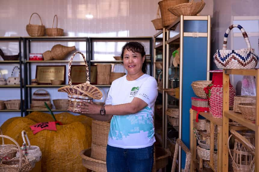 2023年9月2日,阿尔山市西口村村民董亚丽展示柳编产品。通过销售柳编等旅游纪念品,当地村民多了一条增收渠道。