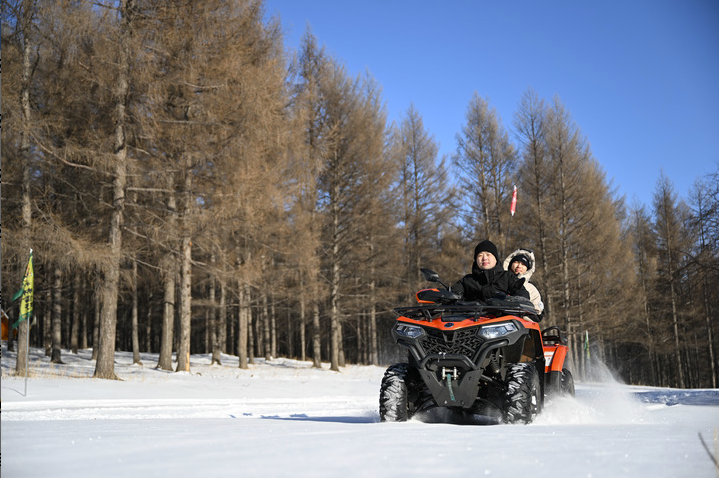 游客在阿尔山市驾驶雪地摩托游玩(2023年12月14日摄)。