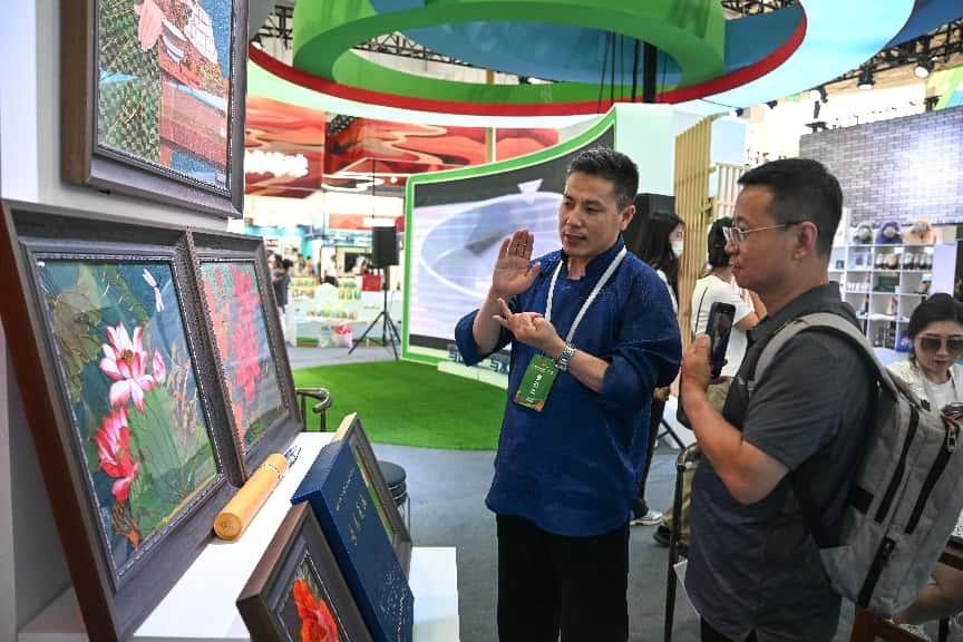 2024年8月29日,参观者在兴安盟展区了解景泰蓝画展品。