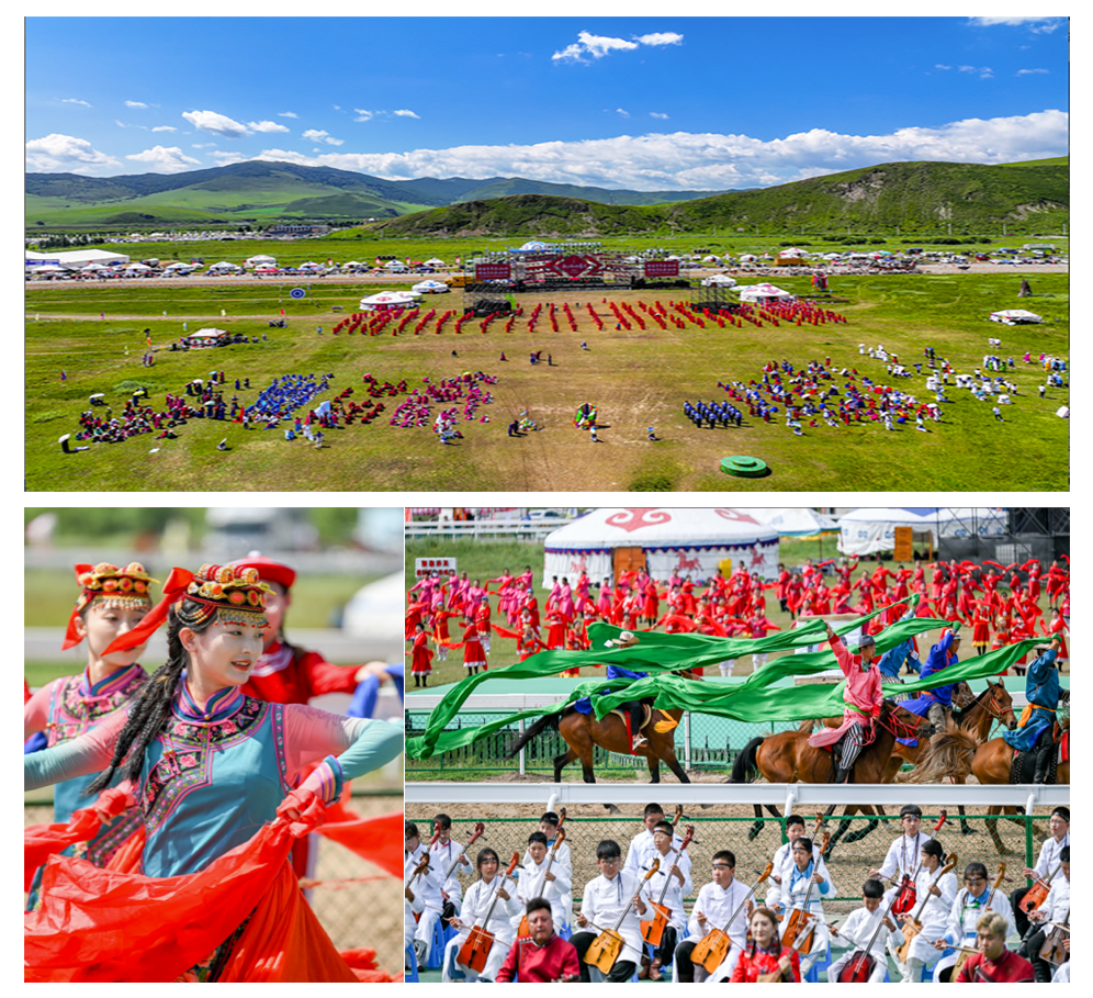 左下、右下:2024年8月8日拍摄的2024兴安盟那达慕开幕式上的文艺表演。